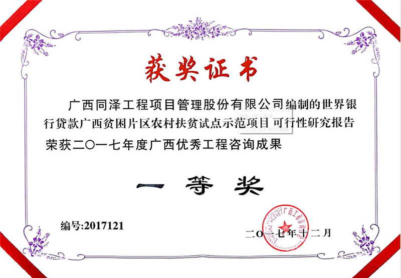 世辦銀行貸款廣西貧困片區(qū)農村扶貧試點示范項目可行性研究報告榮獲2017年度廣西優(yōu)秀工程咨詢成果一等獎